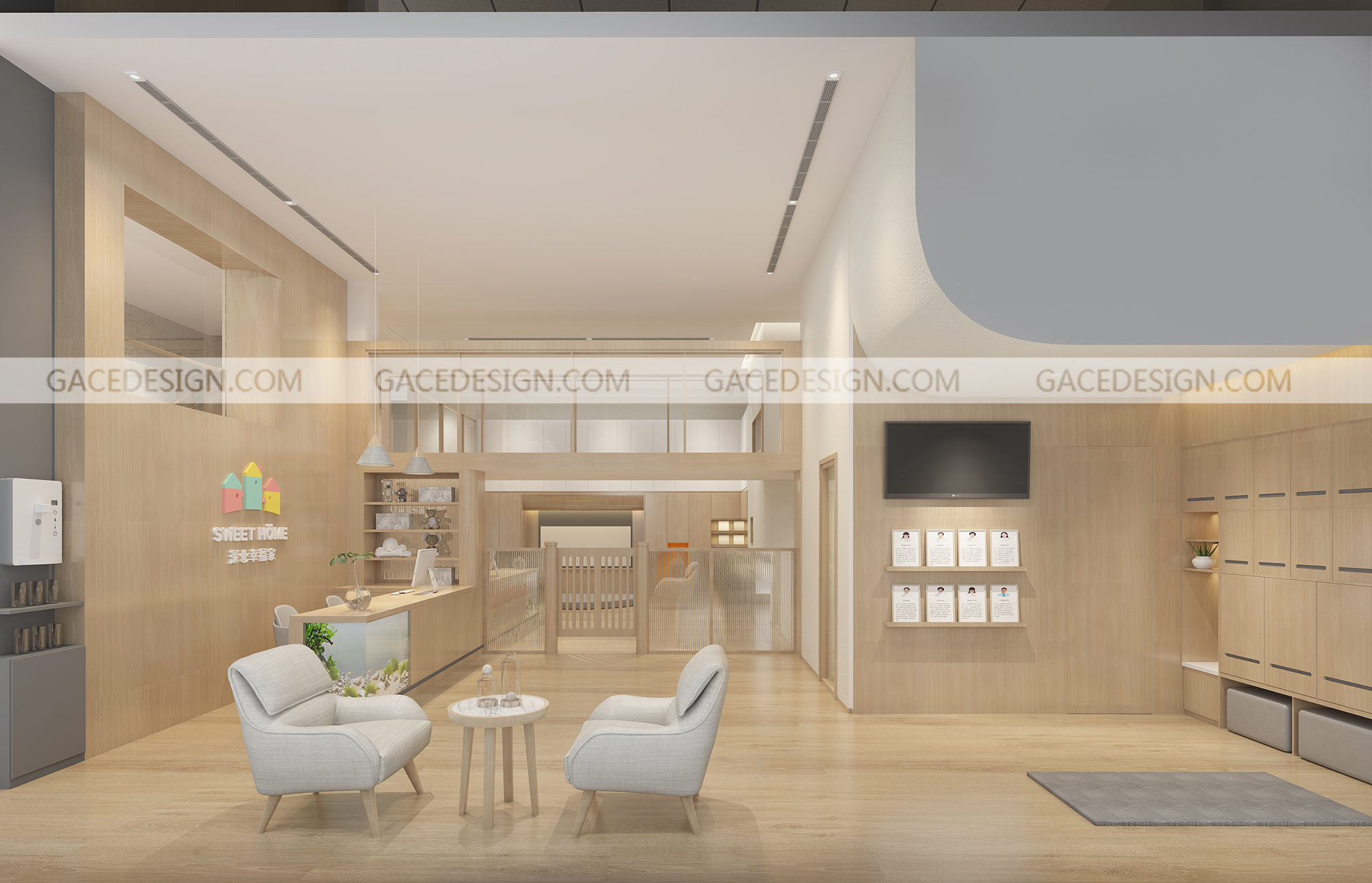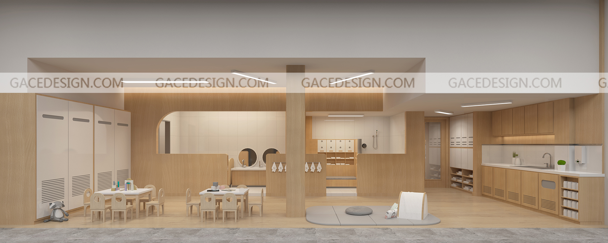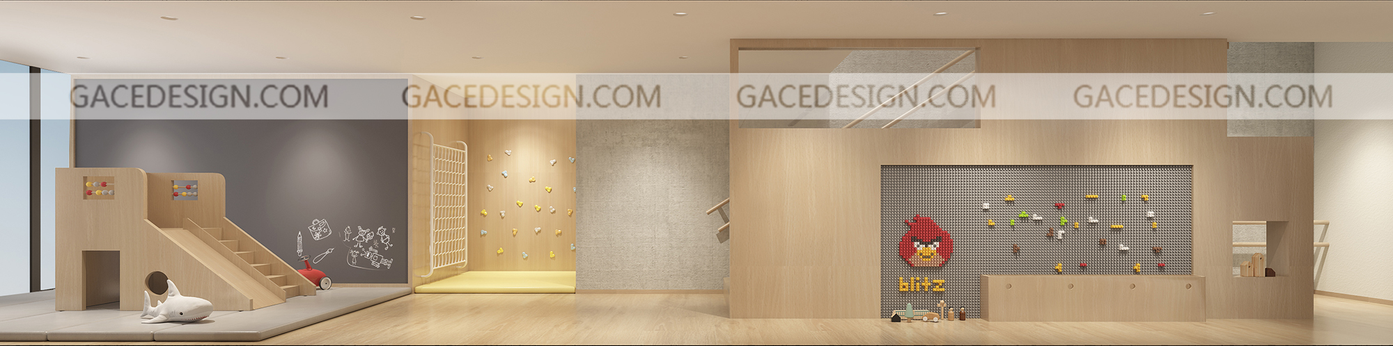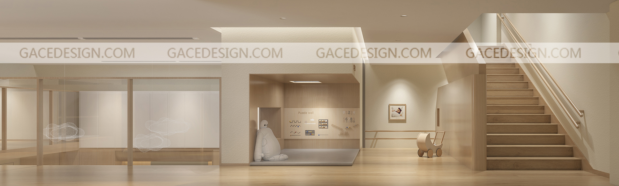 從前廳入口,我們?cè)O(shè)置了一個(gè)門廳,孩子就像回家一樣,在門廳處就完成了換鞋和洗手的功能,孩子有專屬的換鞋凳和鞋柜。空間造型上我們進(jìn)行了簡(jiǎn)化,保留了原有的層高,讓陽光最大程度的映入空間。在前臺(tái)處我們還設(shè)置了孩子尺度可觀賞的魚缸。在空間基調(diào)上我們選擇了柔和木質(zhì)材料與自然光線的映射,使空間呈現(xiàn)明快輕松的氛圍。為了讓孩子自己與環(huán)境互動(dòng),我們?cè)谝粚釉O(shè)置了一個(gè)空曠的空間,孩子們能夠在這里安全的爬行和玩耍,我們根據(jù)不同年齡段孩子的需求還設(shè)置了不同的區(qū)角,益智區(qū)、繪本角、涂鴉墻和感統(tǒng)區(qū)等等。在樓梯閣樓中我們加入了更多可互動(dòng)性的功能。通過墻上的樂高墻壁,區(qū)域角的閱讀小書屋,攀爬區(qū),滑梯,涂鴉墻。除此之外教室設(shè)計(jì)應(yīng)充分的考慮孩子們的尺度和保育員的保育便捷和操作性。我們?cè)陧?xiàng)目中嘗試探討空間與兒童的探索關(guān)系。努力營(yíng)造一種孩子可以自己發(fā)育成長(zhǎng)的環(huán)境模式。