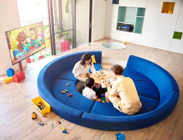 一般家庭最為重視的客廳區域卻被 HAO Design 改成了家庭活動區,下沉式的藍色圓形沙發讓空隙處變成了一個游戲池,倒入海洋球,一家人的溝通從此處開始,可旋轉的電視讓任一角落都能觀看。整面的儲物柜讓雜物隱于無形,干凈整潔的空間更適合孩子的玩耍。(幼兒園設計