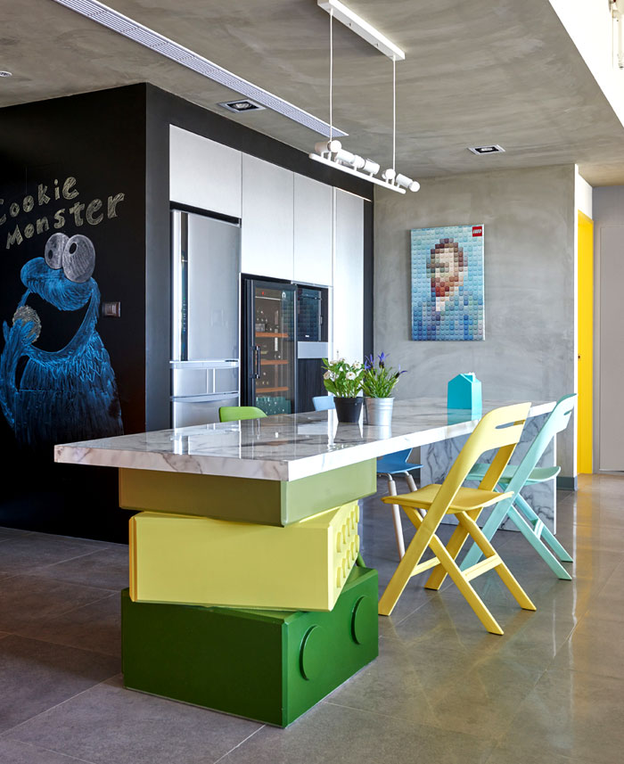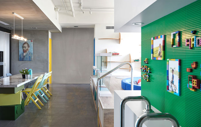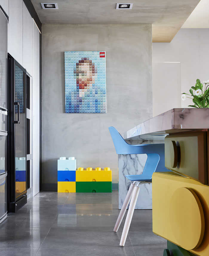 在任一角落似乎都能捕捉到樂高元素,臺階,展示柜,餐桌甚至是墻上的掛畫都被打上了標簽,不同色彩的積木條不僅增添趣味性還讓整個空間變得豐富起來。