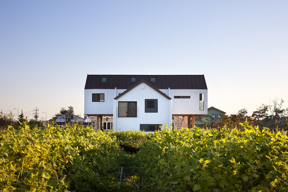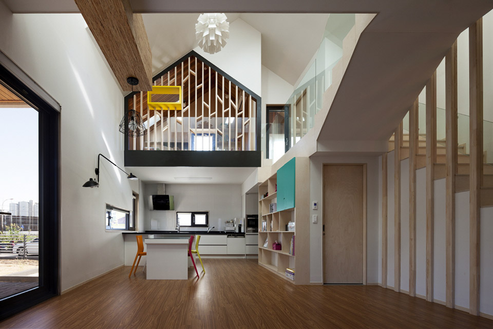 在韓國的益山州市有一棟英文字母“T”型的房子,這棟房子是采用30里面后的膠合木建筑的全木質(zhì)住宅,在T字的兩個(gè)端頭被挑起,分別的形成了入口門廊和客廳的花園休閑平臺(tái),一層為開放的大空間,包含了起居室,廚房和餐廳,第二場(chǎng)則是私人空間,設(shè)有書房,游戲廳和臥室等房間。