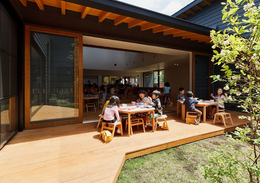 連接建筑物所產(chǎn)生的空間被用作庭院和按不同年齡段分類的花園。計(jì)劃中庭院的大小存在適當(dāng)?shù)木嚯x,使孩子們可以看到同一水平的風(fēng)景。在兒童衛(wèi)生間,面對(duì)庭院的圖畫書室、餐廳和嬰兒室,可以建立他們?cè)谏钪凶匀坏乜吹奖舜说年P(guān)系。