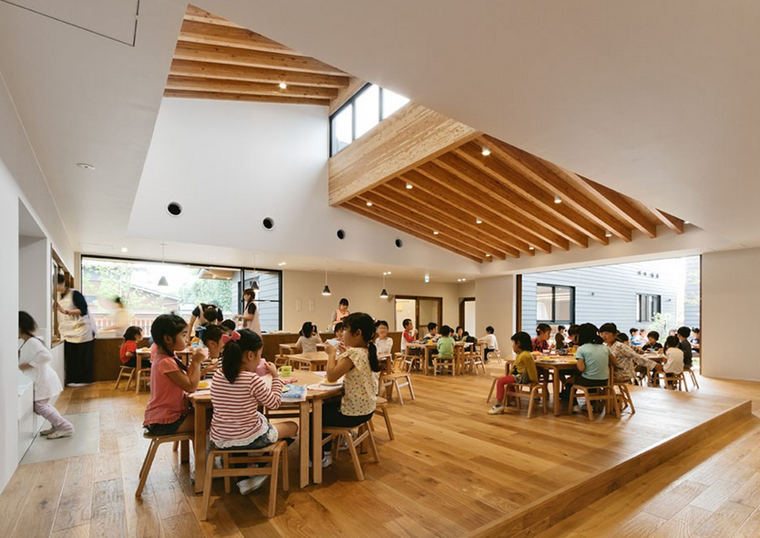 屋頂相互連接,并按照方向和功能劃分等級(jí)。它通過(guò)產(chǎn)生不同高度的天花板提供了上下不一的內(nèi)部空間,并吸引孩子們的好奇心。值得注意的是餐廳。在餐廳,舒適的風(fēng)從與屋頂連接的高側(cè)窗吹過(guò),產(chǎn)生一個(gè)舒適、明亮的空間。