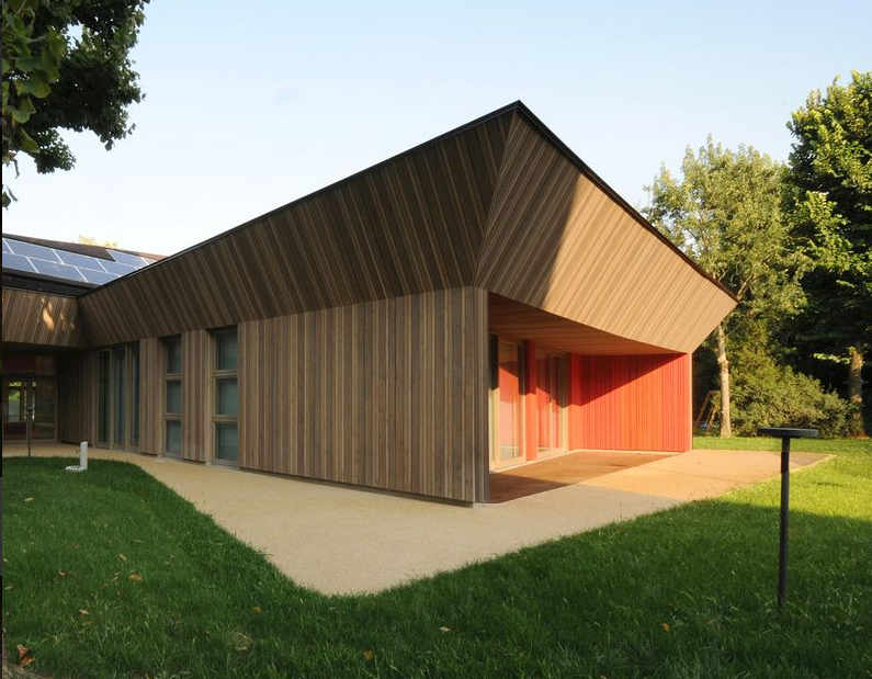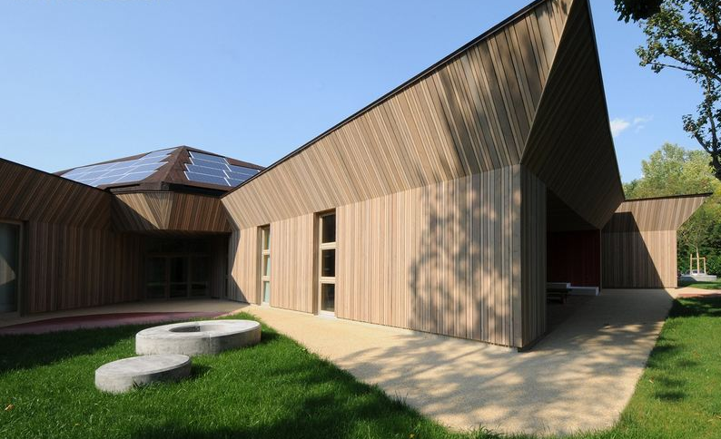 這棟建筑是由一系列連接著中心廣場的建筑群組成的,它的屋頂是不規(guī)則的幾何形狀,就像是皺紋紙一樣——這樣的形狀能更好地發(fā)揮光伏太陽能電池板的作用,這樣一來,在能源方面,這棟建筑幾乎是能夠自給自足了。建筑物的表層是由三種顏色的垂直條紋木板所組成,它們的尺寸是隨意組合的并一直延續(xù)到屋頂下的斜坡區(qū)域,形成了一種多變的紋理圖案,靜靜地被周圍的綠色所圍繞。檐廊及每片側(cè)翼的長廊仿佛是建筑群里的凹陷區(qū)域,并覆蓋了一層珊瑚紅顏色的垂直木板。這個設(shè)計(jì)好比是切片水果,里部的果肉是有色的,而外部的果皮是有紋理的。(幼兒園設(shè)計(jì))