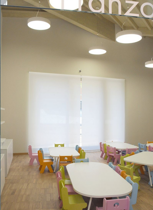位于意大利的尼多卡利賓托兒所位于一個中型區(qū)域,通過一個中心廣場相互連通:這樣就能騰出很多空間給孩子們活動,而整個空間的比例是按照1-2歲的孩子們設(shè)計(jì)的。幾片側(cè)翼由一個單一的屋頂連接,而且都能通向中央大廳,走廊里還裝著空調(diào)。教室和“實(shí)驗(yàn)室”向南分布,優(yōu)先考慮自然采光和綠化帶;辦事處和服務(wù)區(qū)(洗衣房,更衣室,儲藏室)位于北面。