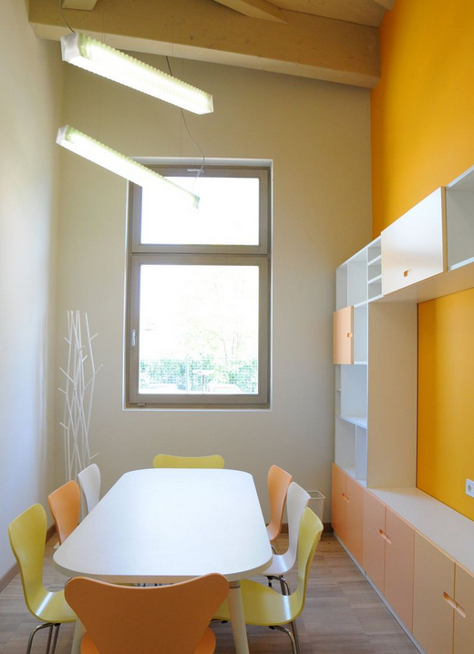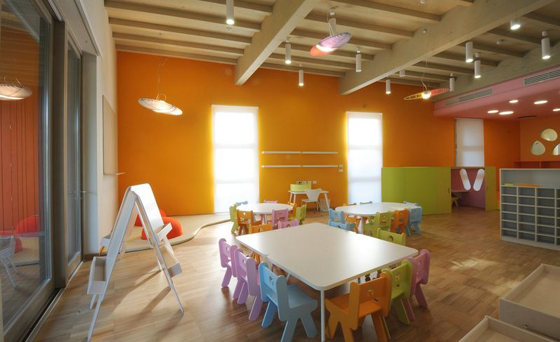 因?yàn)檫@些原因,孩子們應(yīng)該得到良好的環(huán)境并激發(fā)他們的感知。這并不意味著這是混亂的,混雜的,過多的,有著高標(biāo)準(zhǔn),它更是意味著復(fù)雜的,多變的,有著多語言的并能刺激不同的感官感受。幼兒園設(shè)計(jì)不止簡單的以紅黃藍(lán)去作為底色,而是匯聚了許許多多細(xì)微差別的色域,這些色調(diào)一一排列起來,形成了擺動和多變的感覺。將互補(bǔ)的顏色排列起來,其對別的作用有效降低了顏色的飽和度和“容積”。這樣就能更好地創(chuàng)造出層次感:在整個環(huán)境空間使用低飽和度的顏色,家具選擇上使用溫和的顏色,景觀設(shè)計(jì)上使用更為明亮的顏色。(幼兒園室內(nèi)設(shè)計(jì))