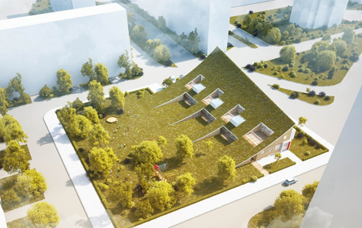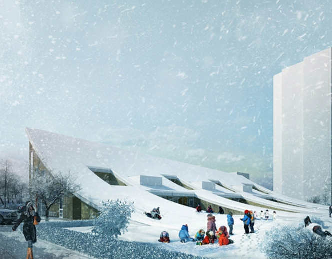 Rastvor的建筑師展現(xiàn)給我們的“山形幼兒園”,傾斜的綠色屋頂好似從地面掀開的一張綠紙,驚鴻一筆卻可以窺視這個(gè)因循守舊的規(guī)則街道所賦予城市的無聊紋理,而這些無聊的紋理周而復(fù)始組成了我們賴以生存的城市,從出生到死亡,每個(gè)人都屈從于規(guī)則之下,卑微而茍且。Rastvor的構(gòu)圖語言是如此鋒利,使屋頂和地面的界限變得模糊。在街道望向幼兒園,如同一段斷裂的地紋,既給孩子們創(chuàng)造了一個(gè)特別的活動(dòng)空間,更讓人聯(lián)想到孩子們與眾不同的想象力。(幼兒園設(shè)計(jì))