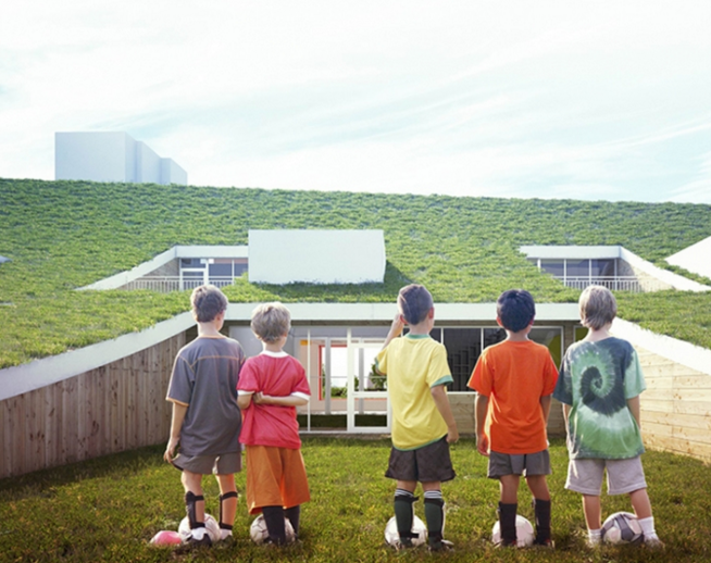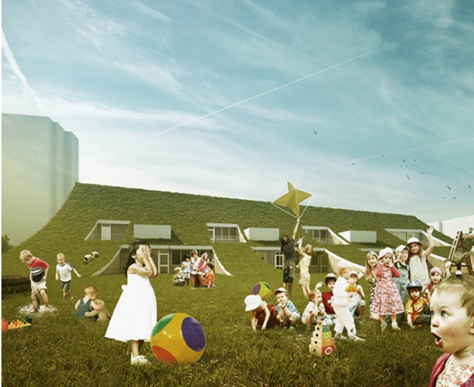 傾斜的屋頂結(jié)構(gòu)是這座建筑最大的特色,它使屋頂和地面的界限變得模糊。傾斜的屋頂煙臺可以為幼兒園的教室?guī)砀嗟年柟狻T诮值赖娜肟谔帲變簣@的屋頂急劇抬高。在街道上望向幼兒園,像是個(gè)滑梯,很有特點(diǎn)。整個(gè)屋頂是綠色的,給孩子們創(chuàng)造了一個(gè)連續(xù)的活動(dòng)空間。傾斜的屋頂煙臺也可以為幼兒園的教室?guī)砀嗟年柟狻_@個(gè)設(shè)計(jì)打破了板整的規(guī)則,不去扼殺孩子們愛玩兒的天性,更是為孩子們的學(xué)習(xí)場所增添了許多的夢幻元素,符合兒童的心理。