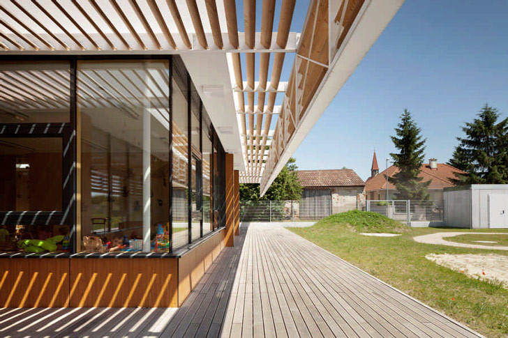 屋頂?shù)脑O(shè)計(jì)和開(kāi)放活動(dòng)室形成一個(gè)新的介于內(nèi)部與外部之間的空間。通過(guò)在南北方向的單位位移,在活動(dòng)室之間形成了視覺(jué)連接效果。這個(gè)專門為幼兒園設(shè)計(jì)的活動(dòng)室完全可以融入教學(xué)工作中。