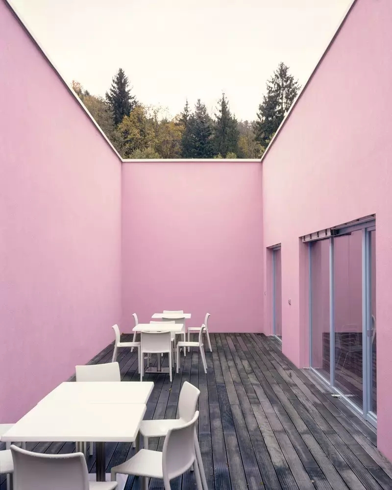 通過巧妙地對日托中心內空間環境的結構排列,例如散步區和寬敞的操場位置的安排,使日托中心呈現出了一種平面拉抻式的獨特空間感覺。在外觀表面的內側,則是一個封閉的景觀環境,一層半高的高度設計,利用孔洞結構提供了一個與外界主馬路相隔離的封閉式屋頂景觀。