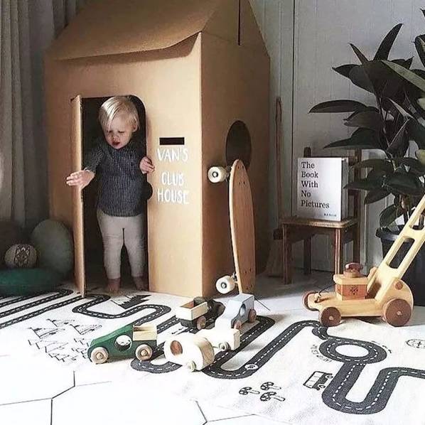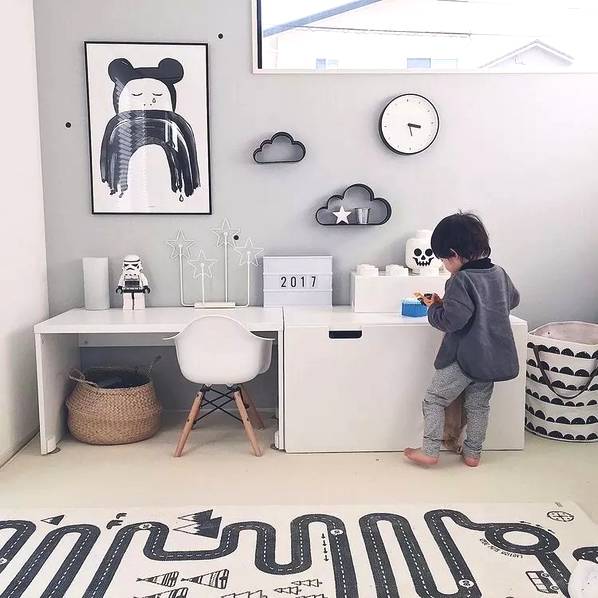 房間里還可以設(shè)置一些簡易的玩樂設(shè)施。1-3歲的孩子需要父母的時刻陪伴,我們可以在房間或者客廳放上爬行墊+安全圍欄給孩子一個小區(qū)域領(lǐng)地,把這里變成一個親子小游戲區(qū)。在兒童房里也可以在地面貼上玩具貼紙,把局部地面變成孩子的游戲地圖,適合在游戲中培養(yǎng)孩子創(chuàng)造力和分享的意識,留出空間,讓孩子可以和朋友或者和父母一起玩玩具,孩子1歲之后我們可以適當(dāng)添置一些矮柜來收納玩具,還可以讓孩子扶著學(xué)走路。在兒童床上加一個木架結(jié)構(gòu),把床做成木房子,給孩子一個開放的獨立空間。這種具象的區(qū)域不僅會給孩子安全感,還能滿足他們的探險欲,
