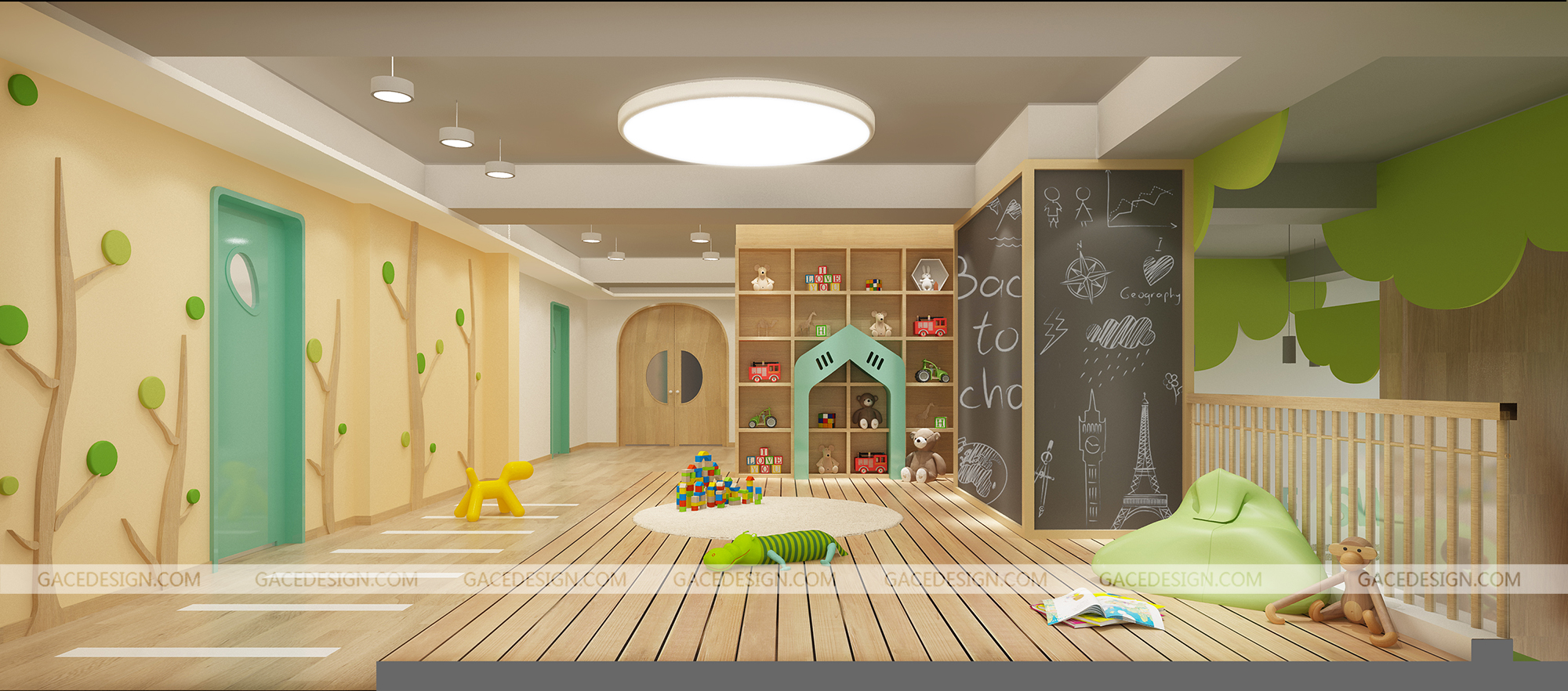 考慮到目前部分幼兒園的室內(nèi)空間不符合標(biāo)準(zhǔn),如果是過(guò)高的空間,可考慮頂面裝修或懸吊一些裝飾物,以降低其空間,改變視覺(jué)上的空曠感。頂面的表層不能太光滑,這樣有利于增強(qiáng)吸聲效果,避免產(chǎn)生眩光。如果是頂層,還要考慮隔熱情況。幼兒園設(shè)計(jì)頂面要使用隔熱、阻燃和防火性能好的裝修材料,如石膏板、鐵龍骨等。電線要放入阻燃管內(nèi),避免因電路故障而引發(fā)火災(zāi)。